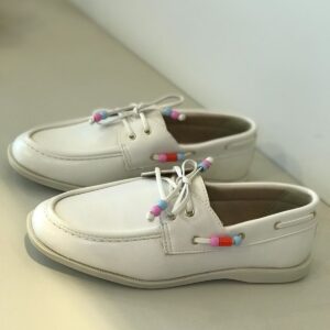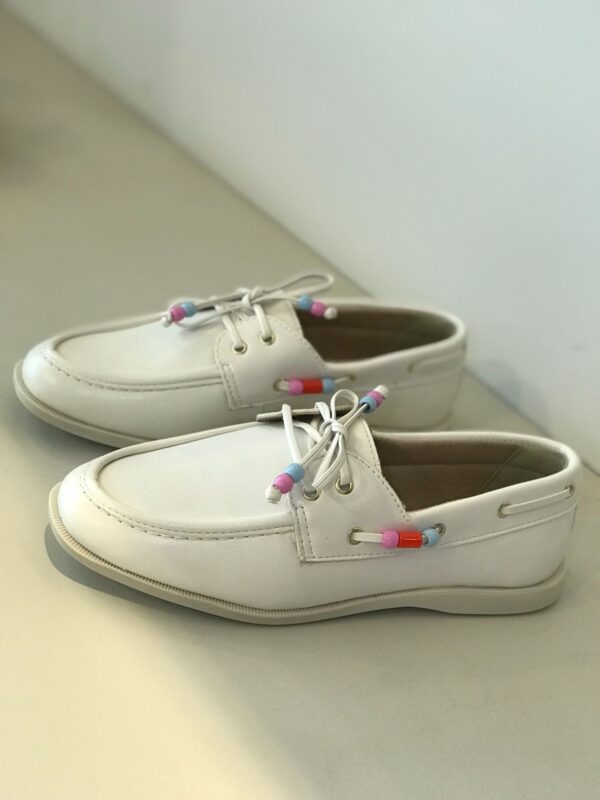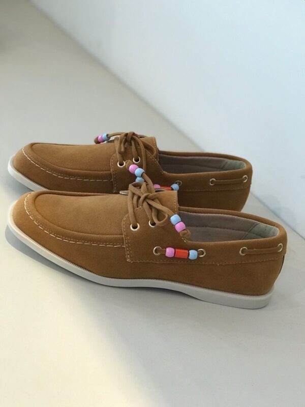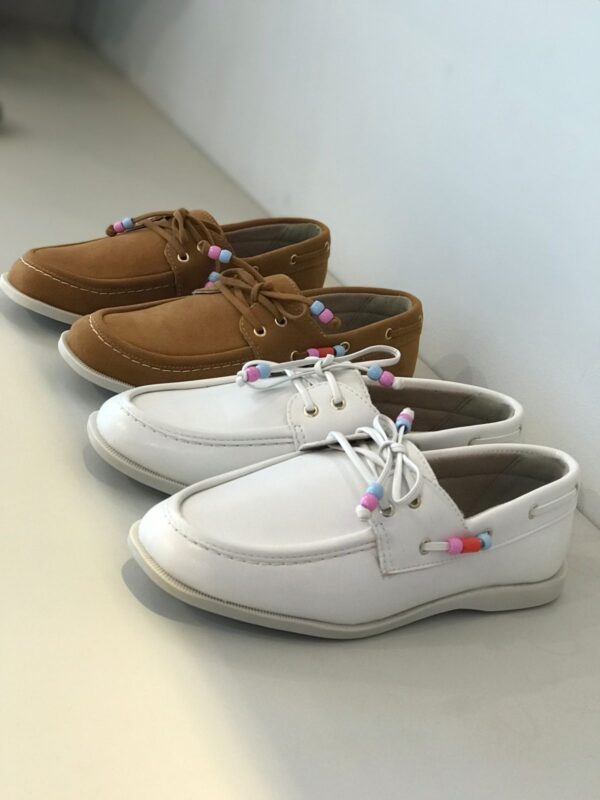 Esse mocassim une conforto, estilo e originalidade em um só calçado. Feito com material macio e acabamento impecável, ele conta com cadarço decorativo e miçangas coloridas que trazem um charme extra ao visual.