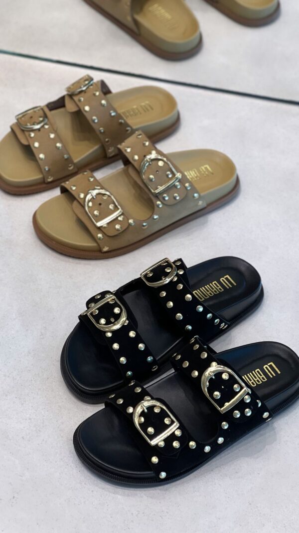 Estilo e conforto se encontram nesta papete moderna. Com duas tiras largas ajustáveis por fivelas metálicas e aplicações de tachas que adicionam um toque de atitude ao look, ela é perfeita para compor produções estilosas e descomplicadas. A palmilha anatômica garante conforto prolongado, ideal para o dia a dia.