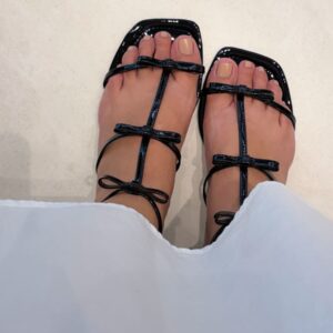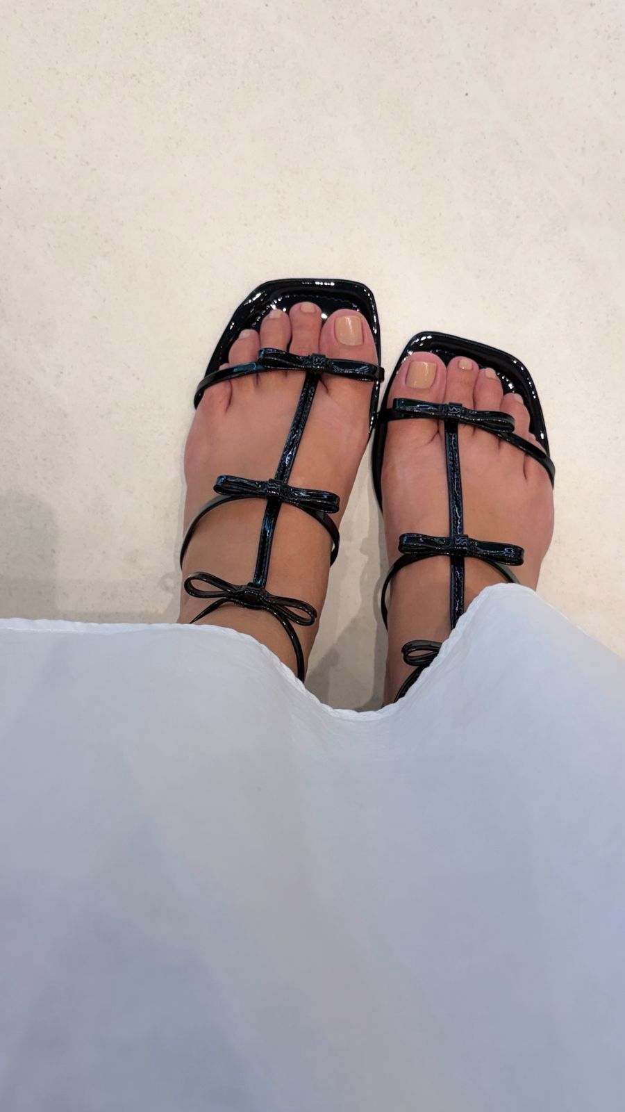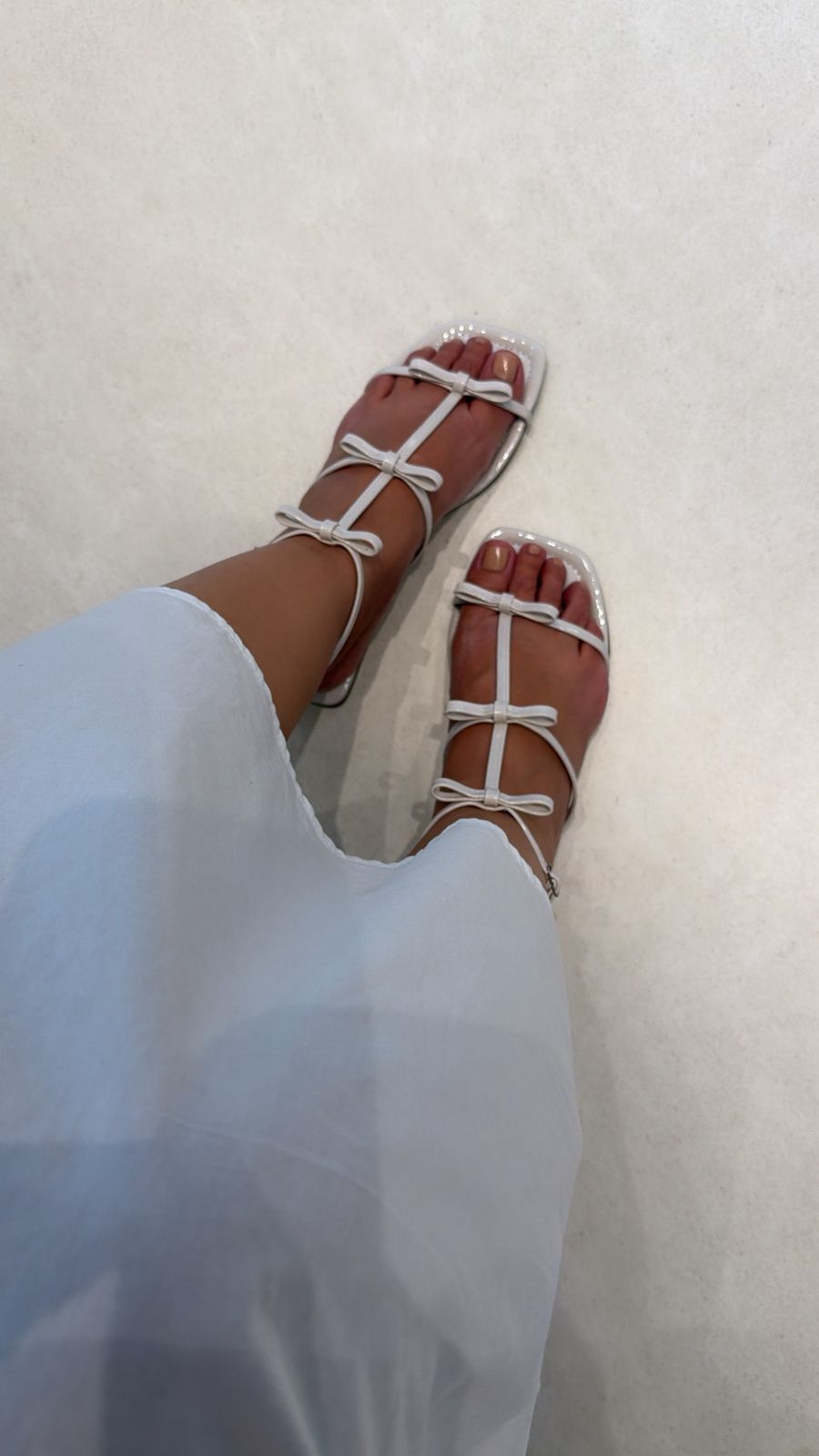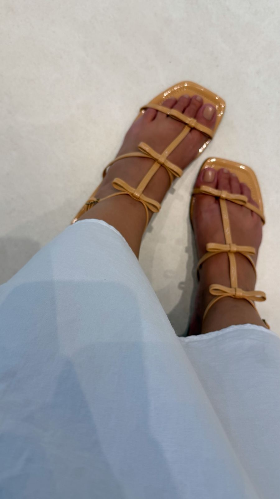 O design com tiras finas e laços delicados traz um visual romântico e sofisticado, enquanto o acabamento metalizado garante o brilho perfeito para realçar seus pés.