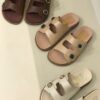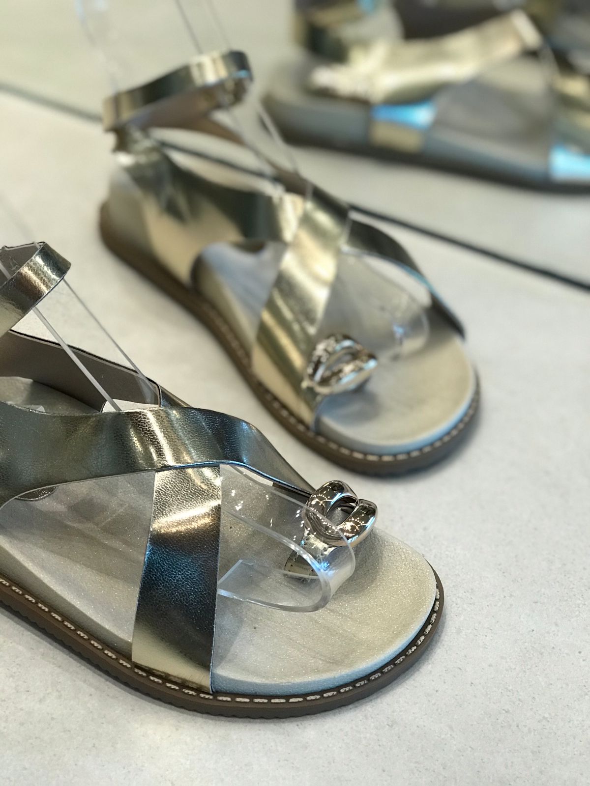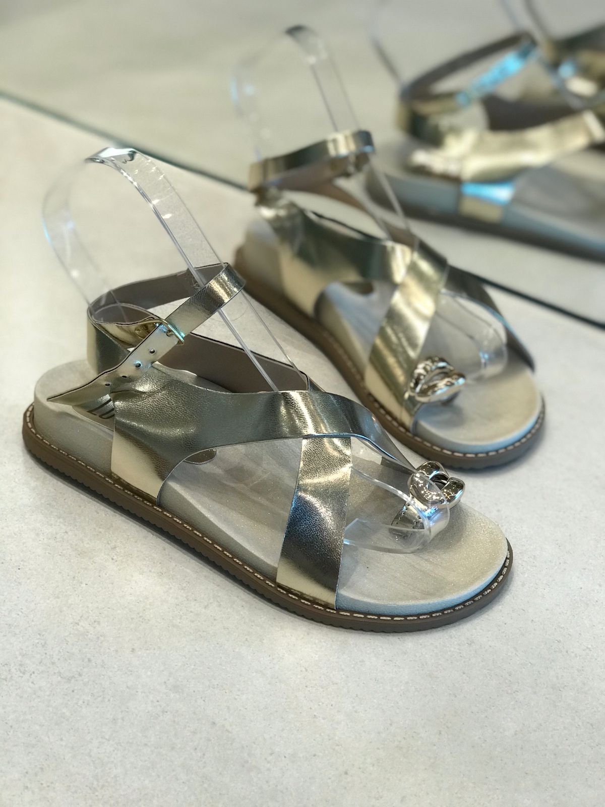 O modelo traz tiras largas metalizadas cruzadas na parte frontal, criando um visual elegante e contemporâneo, perfeito para quem gosta de estilo com praticidade.