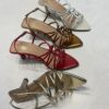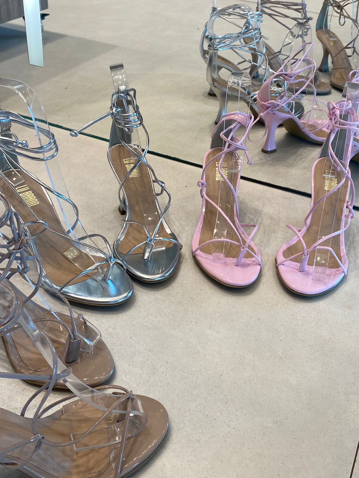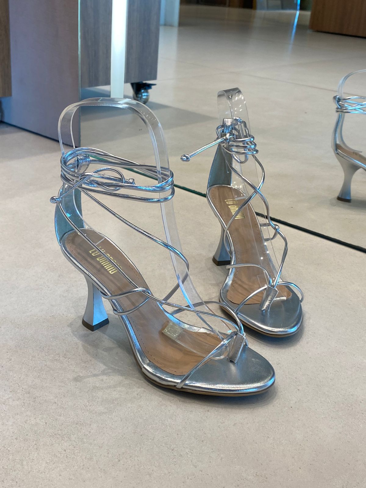 Seu design com tiras metalizadas que se entrelaçam delicadamente nas pernas cria um visual moderno, sensual e cheio de atitude.