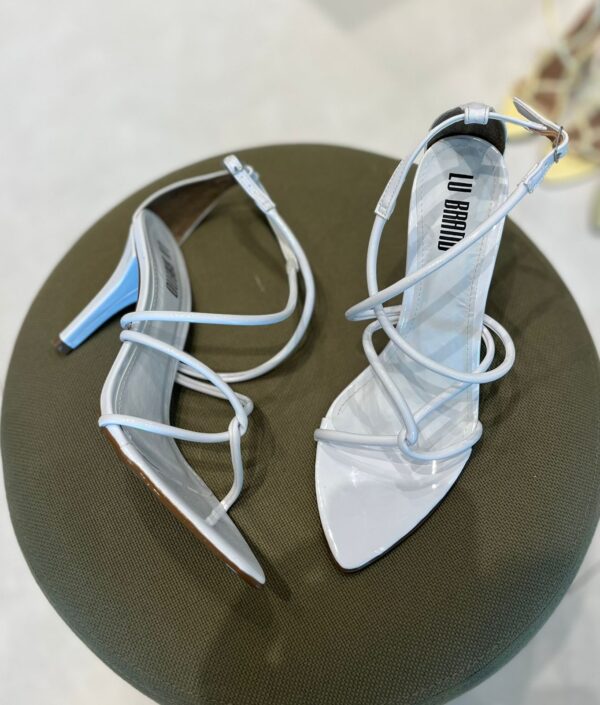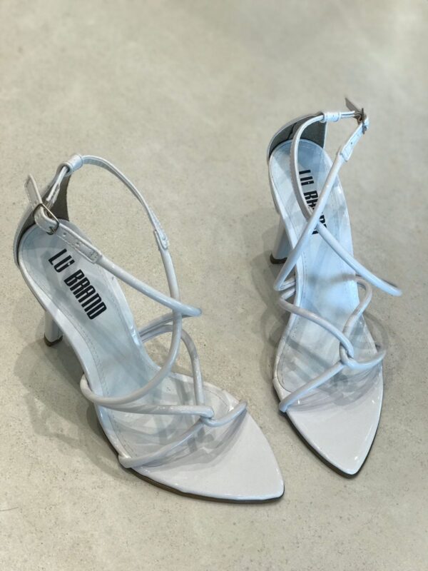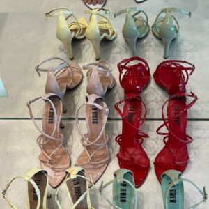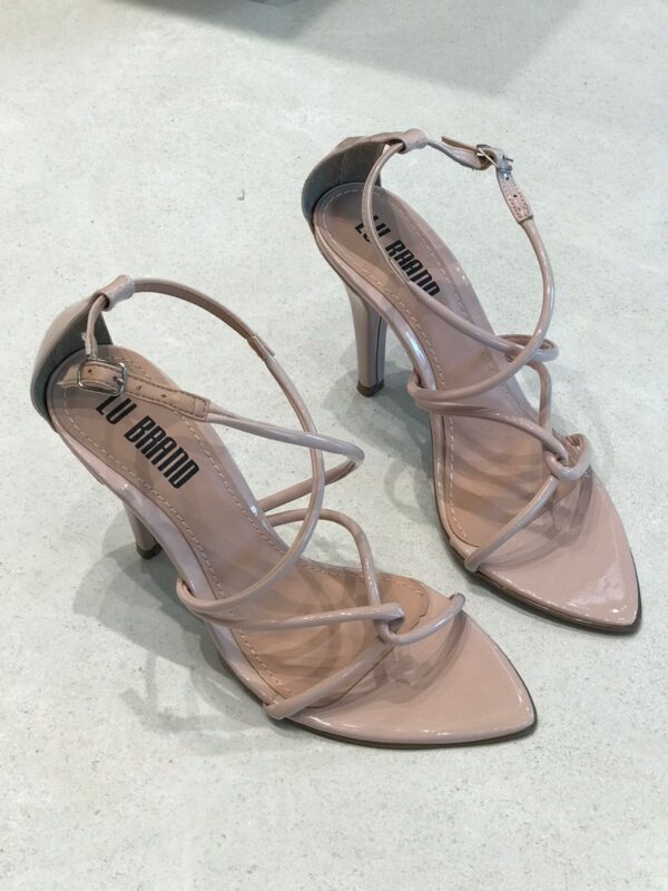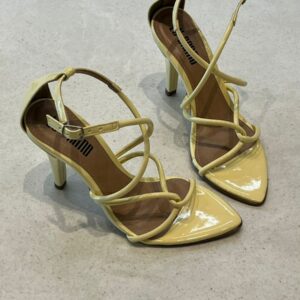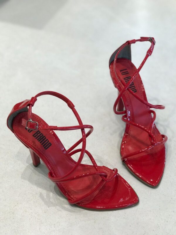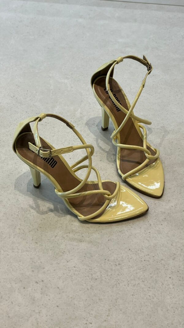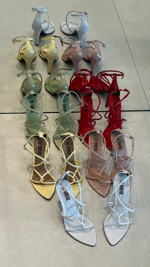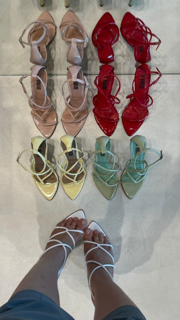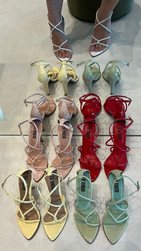 Sandália feminina de salto médio, com design moderno e sofisticado. O modelo traz bico fino e tiras finas em verniz que se cruzam no peito do pé, garantindo um visual elegante e ao mesmo tempo delicado. Possui fechamento lateral com fivela ajustável, proporcionando conforto e segurança ao caminhar. Ideal para compor looks versáteis, vai bem em produções casuais ou sociais, seja com vestidos, saias ou calças. Disponível em diversas cores vibrantes e neutras, como branco, nude, vermelho, amarelo e verde, para você escolher a que mais combina com seu estilo.