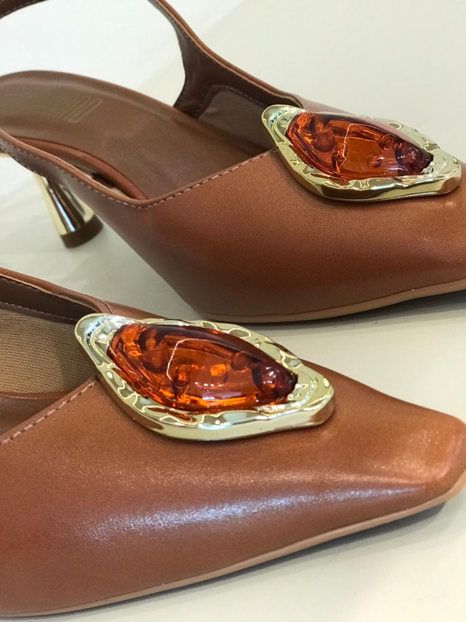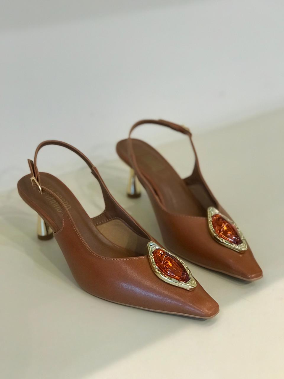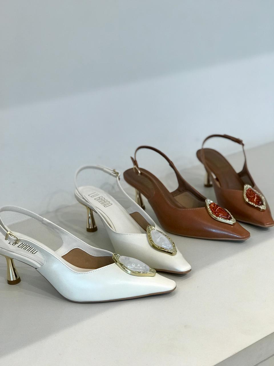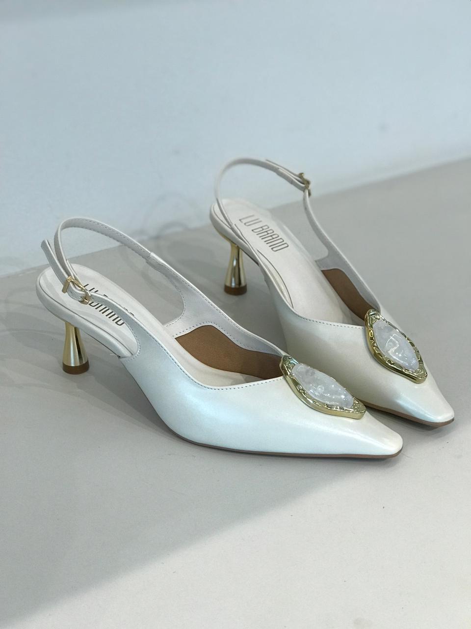Elegância e sofisticação em cada passo. O modelo possui bico fino levemente quadrado na ponta com aplicação de uma madreperola, salto metálico geométrico médio e alça ajustável com fivela, garantindo conforto e firmeza ao caminhar, trazendo um toque clássico e atemporal ao seu look. Ideal para compor produções do dia a dia ao office look ou eventos mais formais com charme e personalidade.