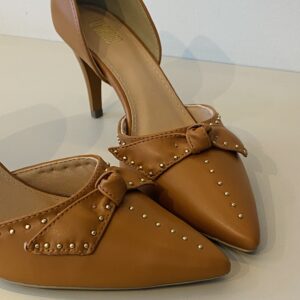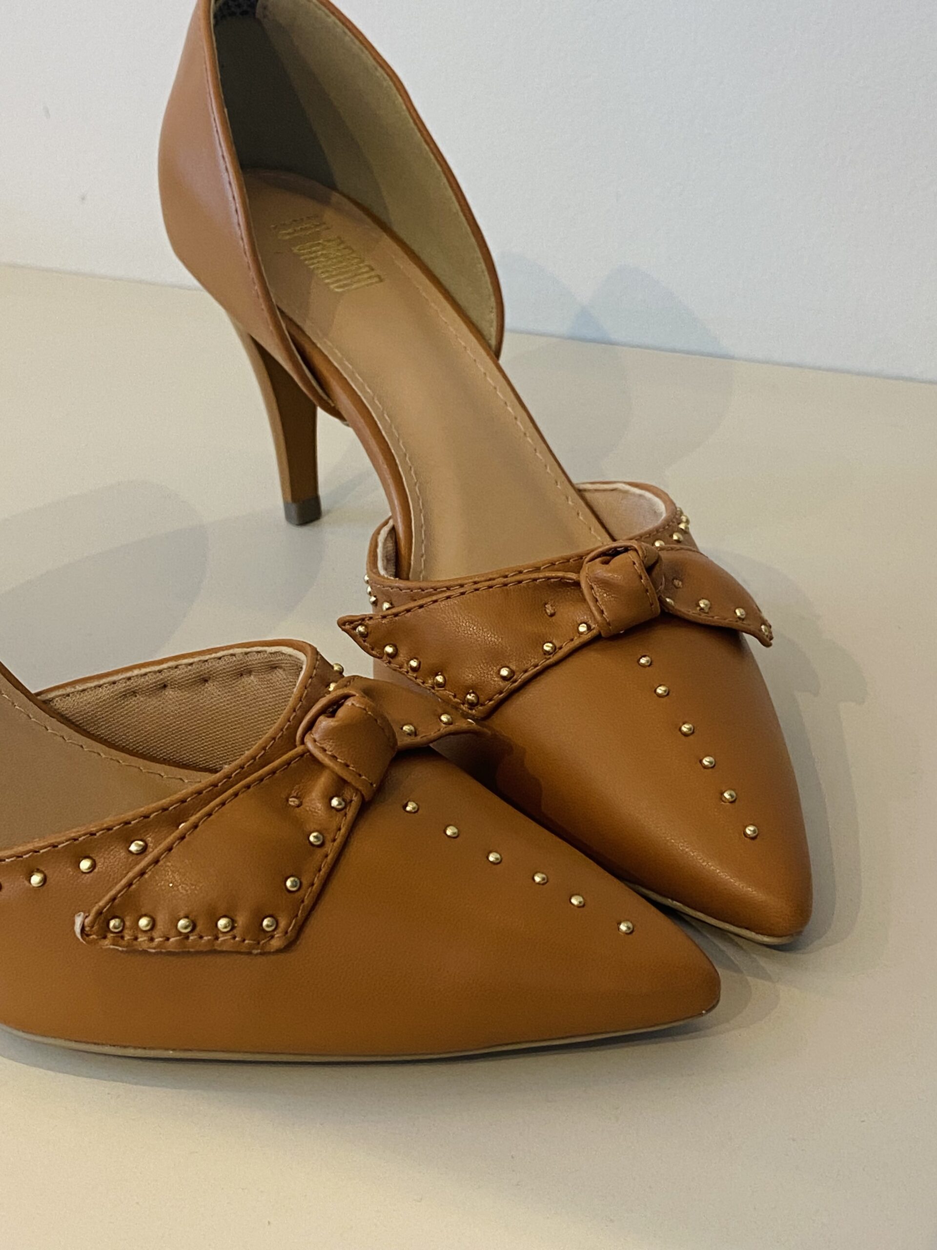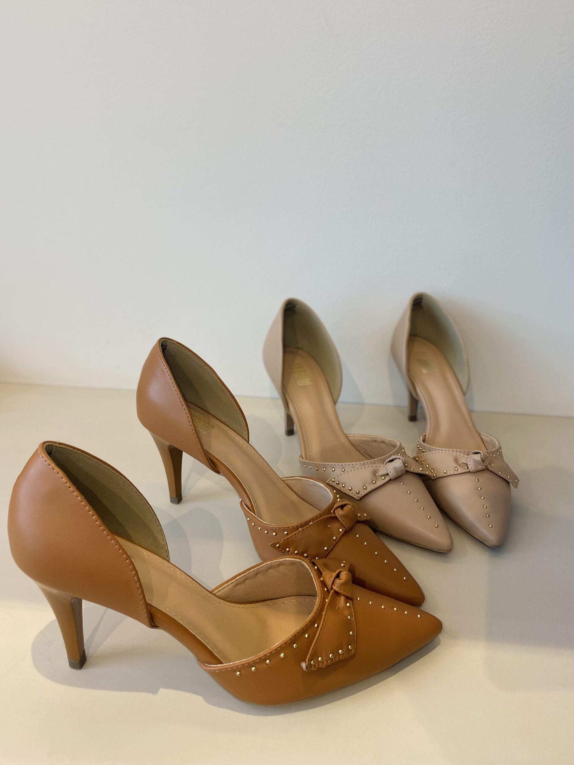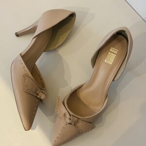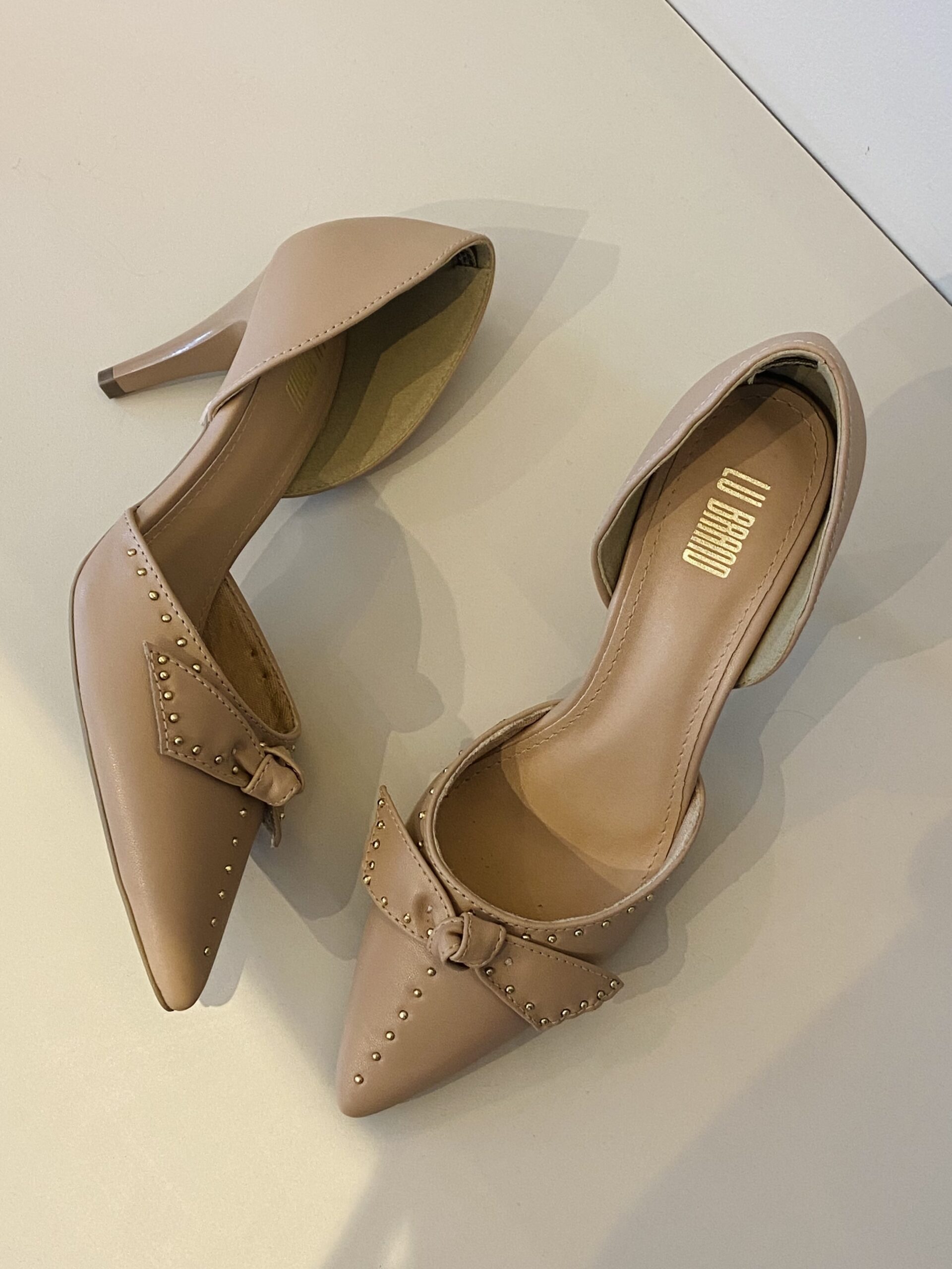 Esse scarpin tem um design elegante e sofisticado, com um bico fino que adiciona um toque refinado ao visual. Ele apresenta um modelo aberto na lateral (d’orsay), o que proporciona um ar moderno e delicado. O detalhe de um pequeno laço com aplicação de tachas metálicas na ponta dá um charme extra e um toque de sofisticação ao calçado. O salto fino e médio contribui para um visual alongado e elegante, sem comprometer muito o conforto.