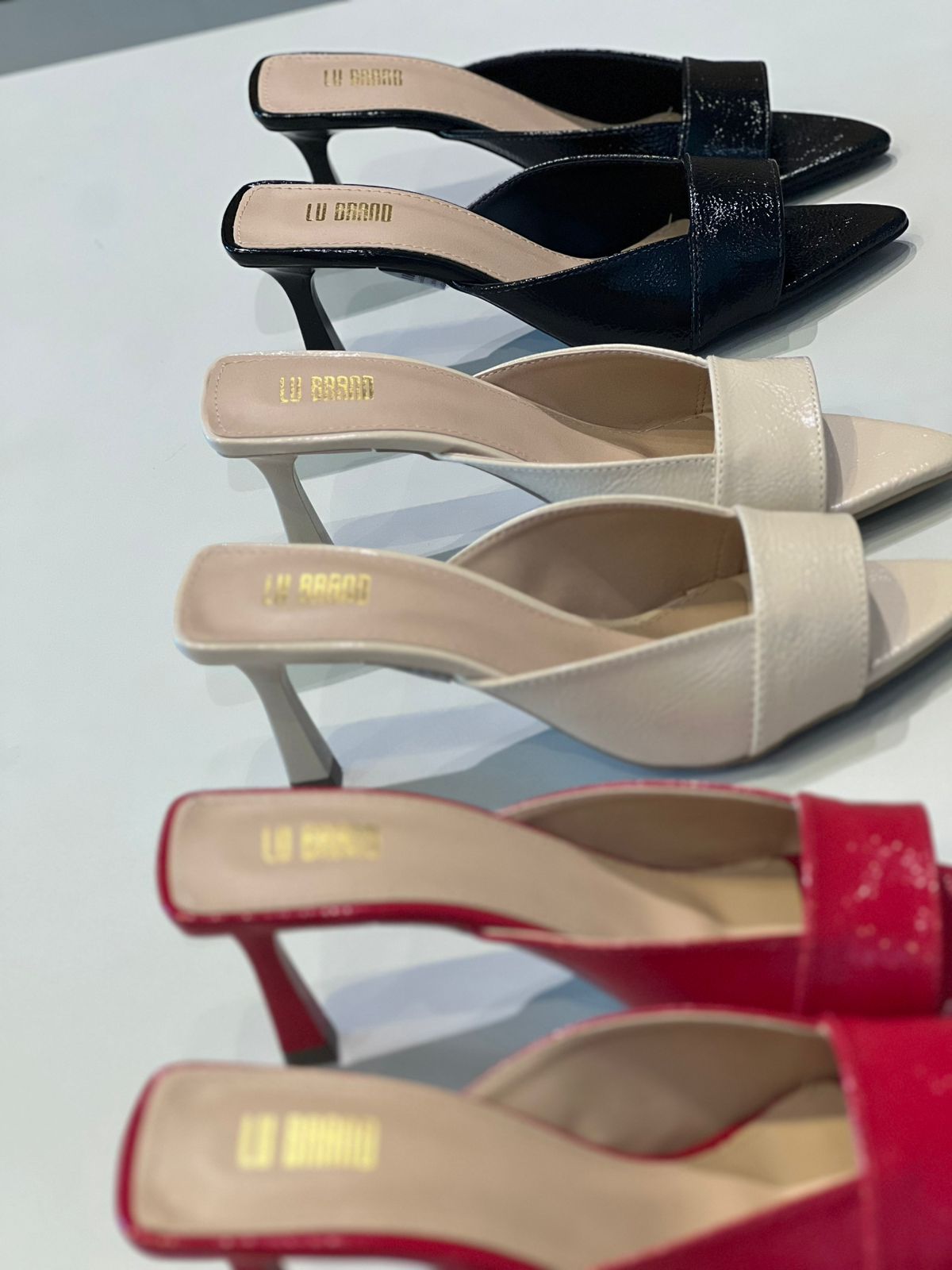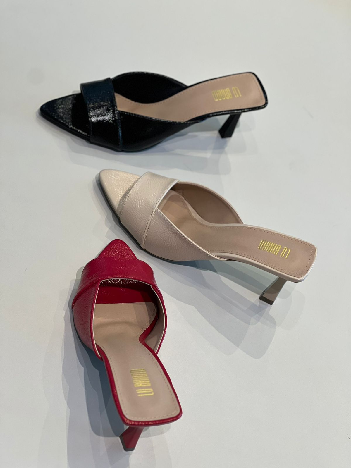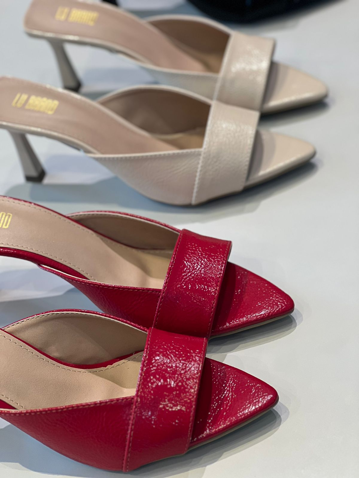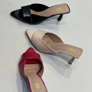 Mule de salto médio com bico fino. O material com acabamento envernizado, proporcionando um brilho sutil. A tira frontal larga cobre parte do peito do pé, garantindo firmeza e conforto. O salto é fino e levemente inclinado, trazendo elegância ao design. O interior do sapato tem acabamento em tom bege, com o nome da marca gravado em dourado na palmilha. Esse estilo é ideal para composições sofisticadas e modernas, combinando bem com diversas ocasiões.