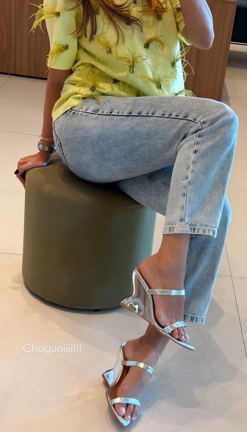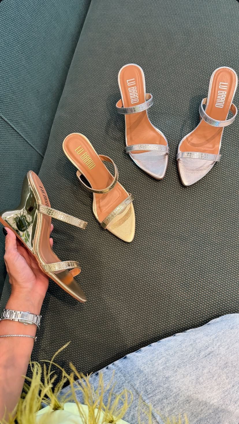 Esse tamanco traz um design sofisticado e super feminino, com bico fino que alonga a silhueta e valoriza o visual. As tiras delicadas, com acabamento texturizado, garantem charme e segurança ao caminhar, enquanto o salto com acabamento metalizado adiciona um brilho irresistível ao look.